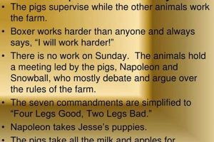 The term, when applied to Orwell’s work, inherently relies on allegorical representations. The narrative’s effectiveness as a critique stems directly from its ability to depict recognizable human behaviors and political structures through animal characters and farm life. The replacement of human farmers with intelligent animals is not merely a narrative device but a calculated strategy to expose the fundamental flaws inherent in systems of power. For example, Napoleon’s character, a clear stand-in for Joseph Stalin, embodies the ruthlessness and paranoia associated with totalitarian rule. Similarly, Squealers role as the propagandist mirrors the manipulation of information employed by oppressive regimes to maintain control. These representations, crucial for decoding the underlying message, offer a simplified yet profound commentary on societal failings.