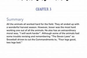 Chapter summaries within a resource for understanding the allegorical novella serve as essential tools for reinforcing comprehension and facilitating efficient review of plot progression. The summaries present concise recaps of key events, character interactions, and thematic developments within each chapter. This function proves particularly useful for students or readers seeking to consolidate their understanding of the narrative or to revisit specific plot points without rereading entire sections of the text. They act as a framework upon which deeper analytical insights can be built. For example, a summary of Chapter 3 might highlight the pigs’ growing control over resources, setting the stage for a later analysis of power dynamics on the farm.